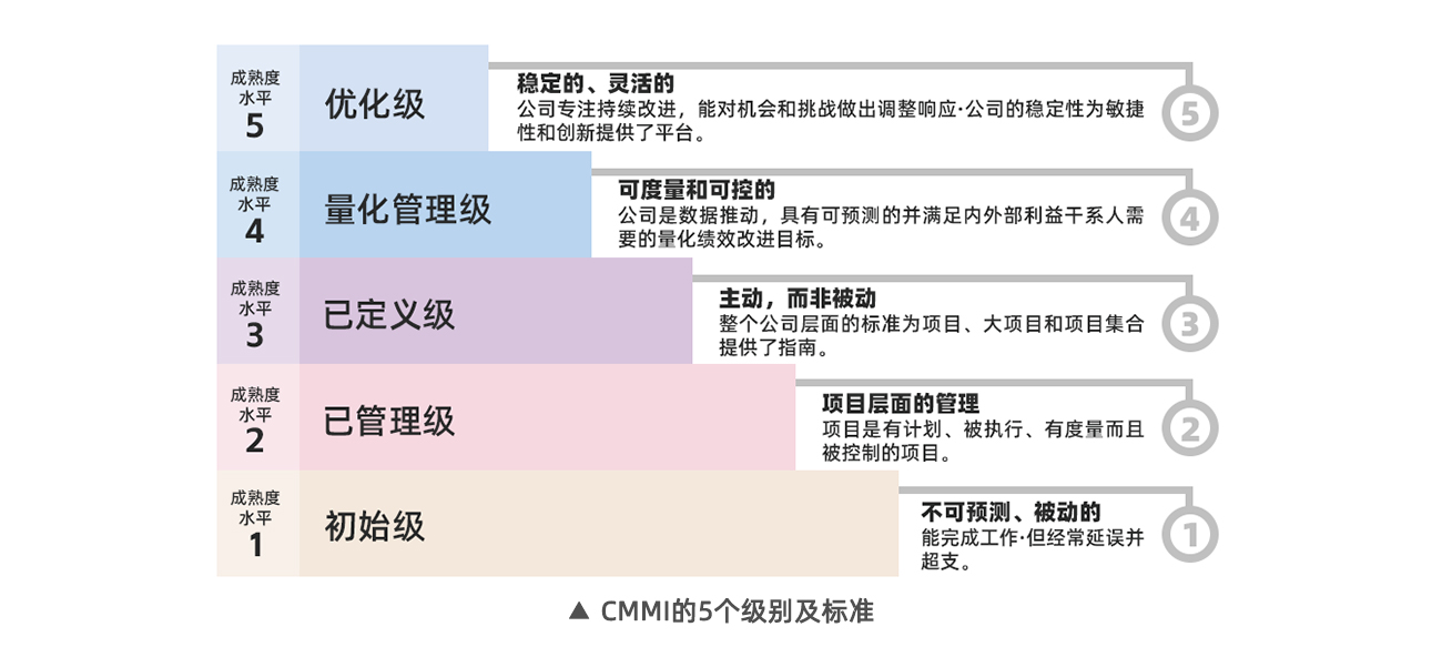 CMMI(Capability Maturity Model Integration)即软件能力成熟度模型,是国际公认衡量企业软件工程开发能力的评估标准,被称为全球软件领域内最具权威的软件开发资质认证体系之一。CMMI共5个级别,分别是初始级、可管理级、已定义级、量化管理级和优化级。CMMI5为最高等级,通过CMMI5级认证代表企业在软件研发中具有持续优化和创新的能力,能够根据自身业务目标和价值需求,持续改善软件研发过程各环节,在软件开发和项目管理方面已达到高成熟度。