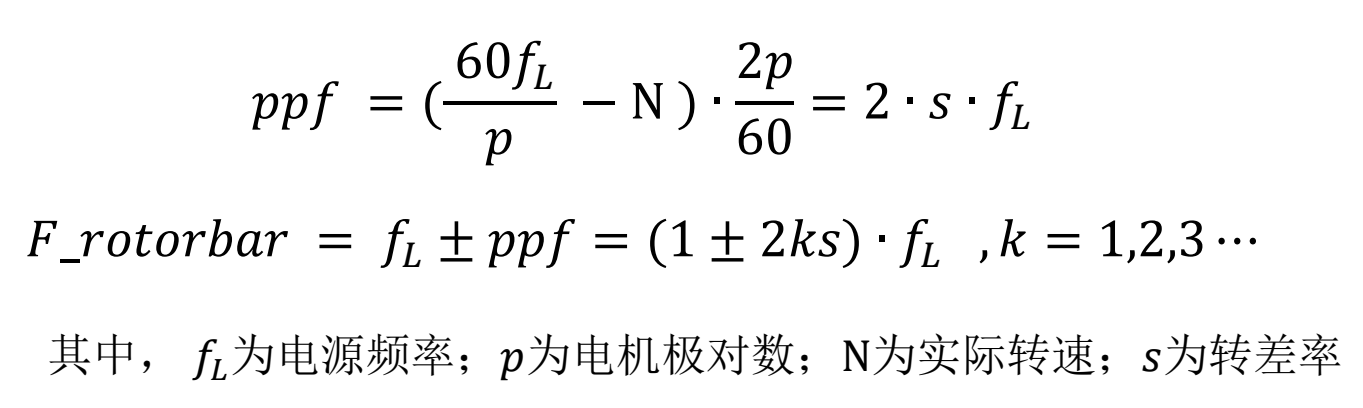 MCSA 是诊断转子断条的有效方法。在电流特征中,电动机极通过频率 ppf(滑差频率 x 极数)在频谱图上表现为工频〖 f〗_L的边带,在 〖 f〗_L ± ppf 处可看到ppf的峰值。ppf峰值的大小是转子健康的重要指标。
